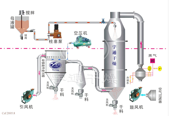 The air enters the heater through the filter, is exchanged into hot air, and enters the hot air distributor on the top of the drying chamber, so that the air uniformly enters the drying chamber in a rotating shape or parallel axis. The material liquid needs to be sieved and pumped by high pressure to the nozzle located at the top center of the drying chamber to atomize the material liquid evenly, so that the surface area of the droplet is greatly increased, and the contact with the hot air causes the water to evaporate rapidly and dry into granular products in a very short time. Most of the products are collected by the discharge port located at the bottom of the tower, and the waste gas and small powder particles are separated by the rotary wind separator. The finished product is collected by the collection cylinder at the lower end of the cyclone separator, and the exhaust gas is discharged by the extraction fan.