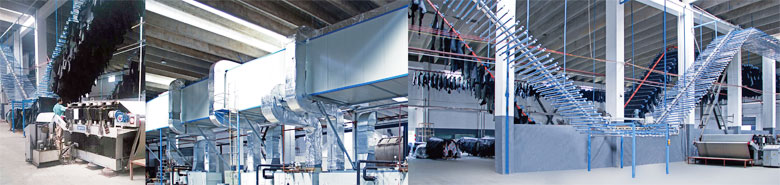 The through-type low-temperature leather drying system we developed consists of hanging chain system,drying tunnel and drying temperature air conditioning unit.The drying tunnel is divided into several parts by low-temperature drying system to independently control the temperature and humidity and offer a steady and progressive drying environment for leather.The drying system can reduce the shrink during the drying process to the maximum extent and ensure high drying efficiency.
