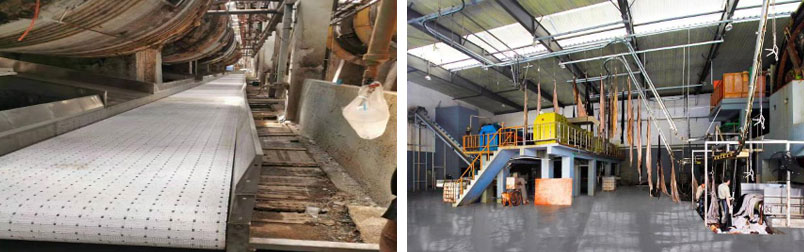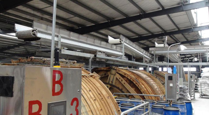 GZGCL With the higher and higher requirements of national tanning enterprises, the design and processing requirements of tanning machinery are also gradually improved. This requires tannery machinery processing higher efficiency, lower energy consumption, automation, intelligent, higher safety, reduce the number of operators and labor intensity. To realize the automation, intelligence and information upgrade of tannery enterprises. The automatic conveying line produced by our company has leather conveying (into and come out of the drum), automatic water supply, automatic chemical material feeding system; Automatic control system of leather production and processing, on-line detection and control technology of leather production process; Tanning waste liquid circulation system and supporting testing equipment. 1. Fur conveyor line( into the drum) The conveyor belt transports the leather directly from the fur storehouse to the drum that needs to be put into production, which can be weighed automatically. After reaching the specified weight, the drum door closes, and the conveyor belt transports the leather to other drum according to the set program.