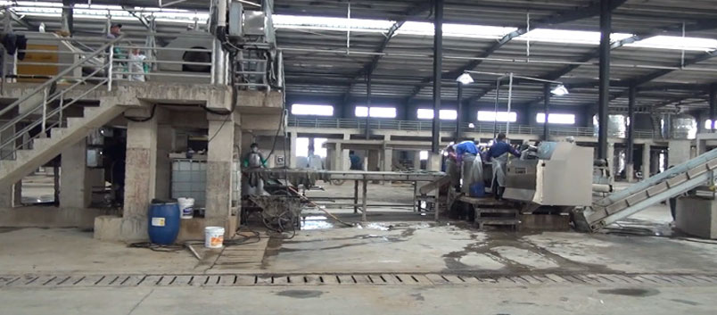 3. The conveying line is used for expanding the skin into the drum and conveying meat dregs After removing the meat, the skin automatically slides to the conveying line (due to the different tanneries’ technology, some tanneries add an automatic conveying platform here for trimming),After the conveyor line is automatically weighed, it is sent to the designated drum for ash dipping and expansion. The meat dregs scraped from the skin are sent to the meat dregs press by the meat dregs conveying line.