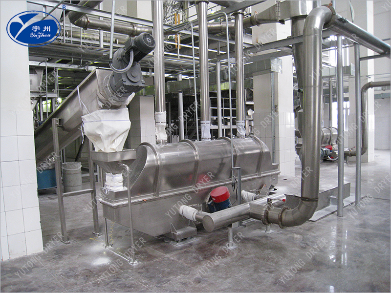 物料自進料口進入機內,在振動力作用下,物料沿水平面流化床拋擲,向前連續運動,熱風向上穿過流化床同濕物料換熱后,濕空氣經旋風分離器除塵后由排風口排出.干燥物料由排料口排出。