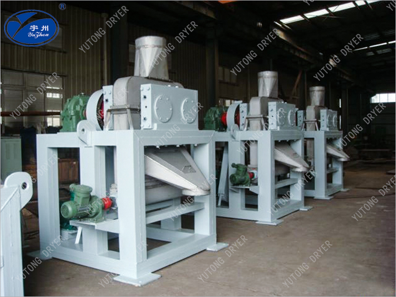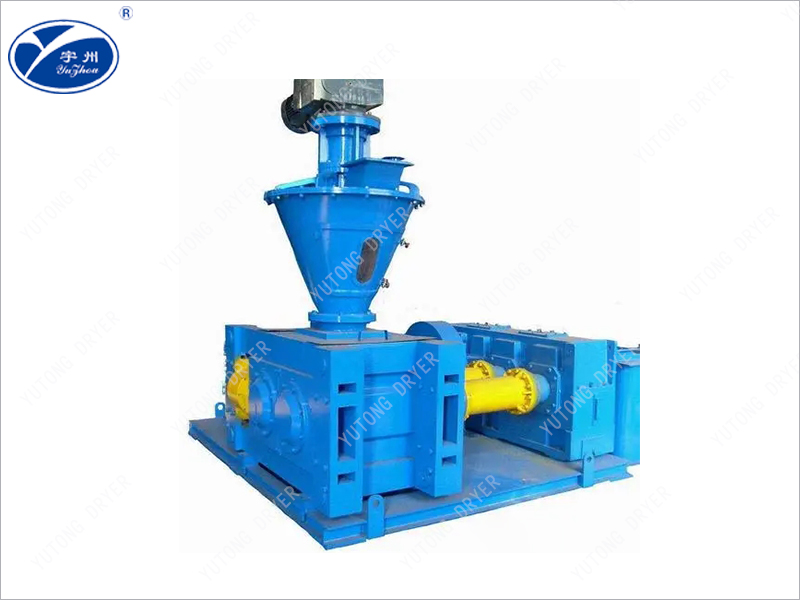 各種干粉物料從設備頂部加入,經(jīng)脫氣、螺旋預壓進入兩個平等軋輥,軋輥相對旋轉(zhuǎn),物料被強制送入兩輥之間,帶槽軋輥將物料咬入輥隙被強制壓縮,物料通過壓縮區(qū)后,物料的表面張力和重力使之自然脫出。脫出后的指條狀團塊進入碎粒機由旋轉(zhuǎn)刀排破碎,被破碎的物料進入整粒機通過滾動刀排使顆粒和部分粉狀物料進入旋振篩進行篩分。合格品通過輸送機被送入成品倉。粉狀篩下物料通過輸送機再次被送回原料倉進行二次輥壓,擠壓力的大小可根據(jù)造粒操作的需要由液壓油缸的壓力進行調(diào)節(jié)。 通過改變輥面開槽形式,可得到片狀、條狀、扁球狀物料。