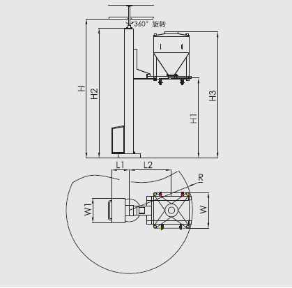 該機只要由立柱、轉動底盤、提升叉架、液壓系統和控制系統組成。工作時將裝滿物料的料斗推入提升叉架上,操作提升操作桿,將料斗提升到加料高度后轉動立柱與加料設備對接,打開出料蝶閥,使物料轉移到下一工序設備。