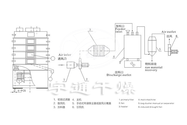 Влажный материал поступает в спиральный слой из верхнего входного отверстия, и под действием периферической ударной силы и гравитации материал прыгает вверх и вниз по спиральному слою до выхода из нижнего слоя; В то же время чистый горячий воздух поступает со дна спирального слоя, полностью передает теплоноситель с материалами, распределенными на кровати, и выходит через верхние вентиляционные отверстия, тем самым достигая цели сухого влажного материала.
